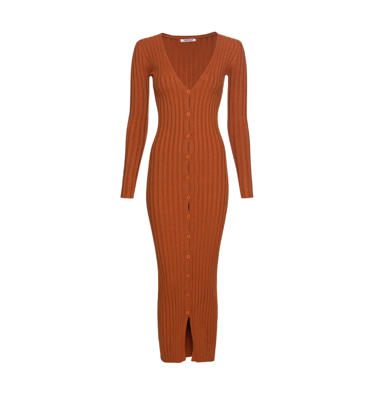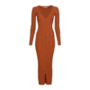Mot. megzta suknelė, rudos spalvos , užegimas sagomis per visa ilgi, ilgomis rankovėmis.
