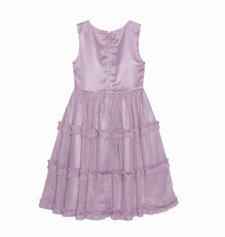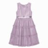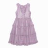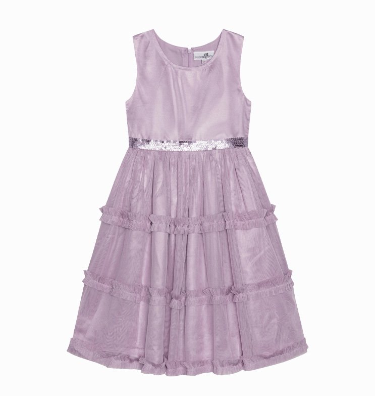 Vaik. kokteilinė suknelė, violetinės spalvos, be rankovių, apvali kaklo iškirptė, užsegimas užtrauktuku, vienspalvio rašto, puošta žvyneliais, ilgis iki kelių.