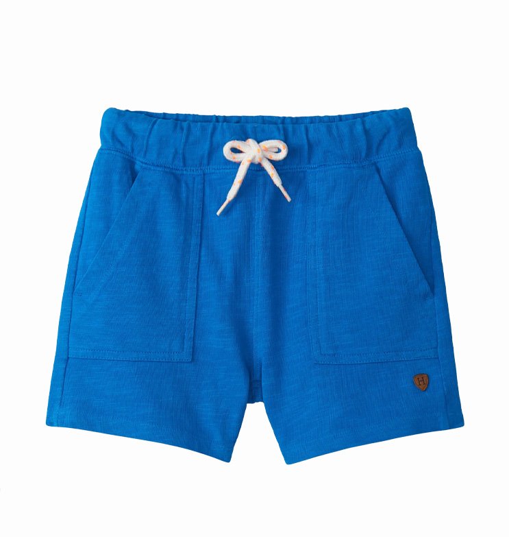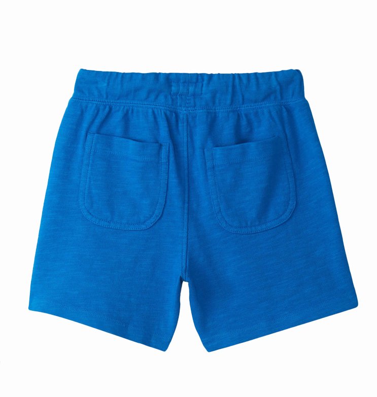 Vaik. šortai, mėlynos spalvos, elastinė juosmens juosta su raišteliais, šoninės kišenės, logotipo detalė.