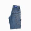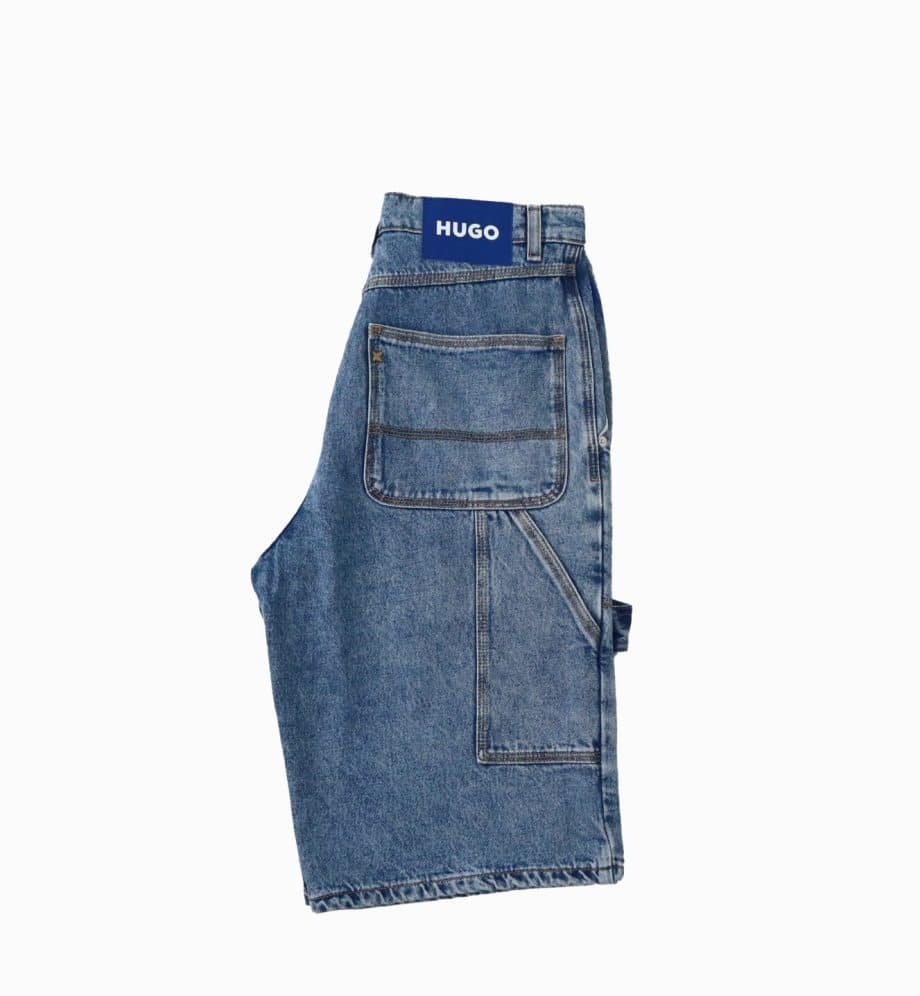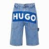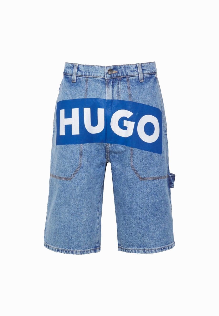 Vyr. džinsiniai šortai, žydros spalvos, užsegimas saga ir užtrauktuku, šoninės ir užpakalinės kišenės, logotipo spaudinys, tiesus kirpimas, ilgis iki kelių.