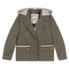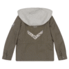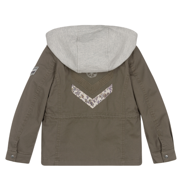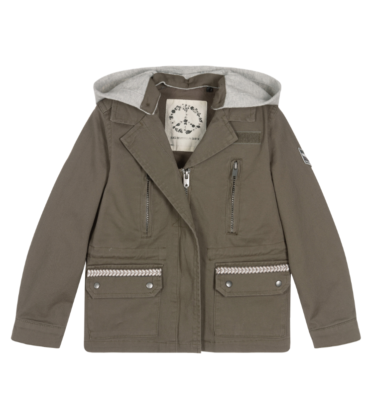 Vaik. džinsinė striukė, chaki spalvos, ilgomis rankovėmis, užsegimas užtrauktuku per visą ilgį, šoninės kišenės, gobtuvas.