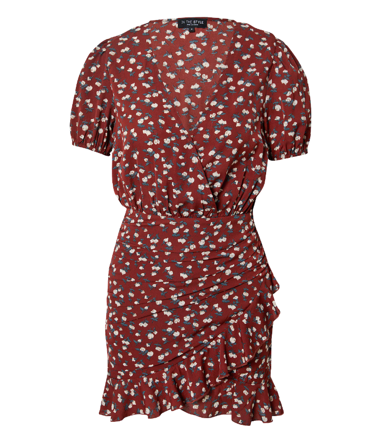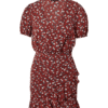 Mot. suknelė, rudos spalvos, smulkių gėlių raštas, trumpomis pūstomis rankovėmis, ir V iškirptę, turi paraukimus ties juosmeniu.