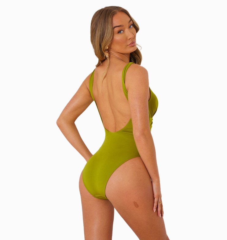 Mot. maudymosi kostiumėlis, žalios spalvos, vientisas, V formos iškirptė, be užsegimo, atvira nugara.