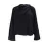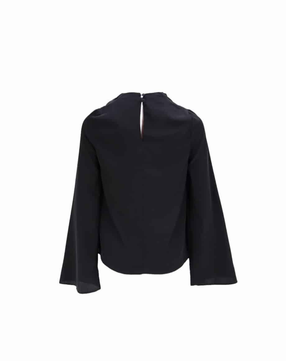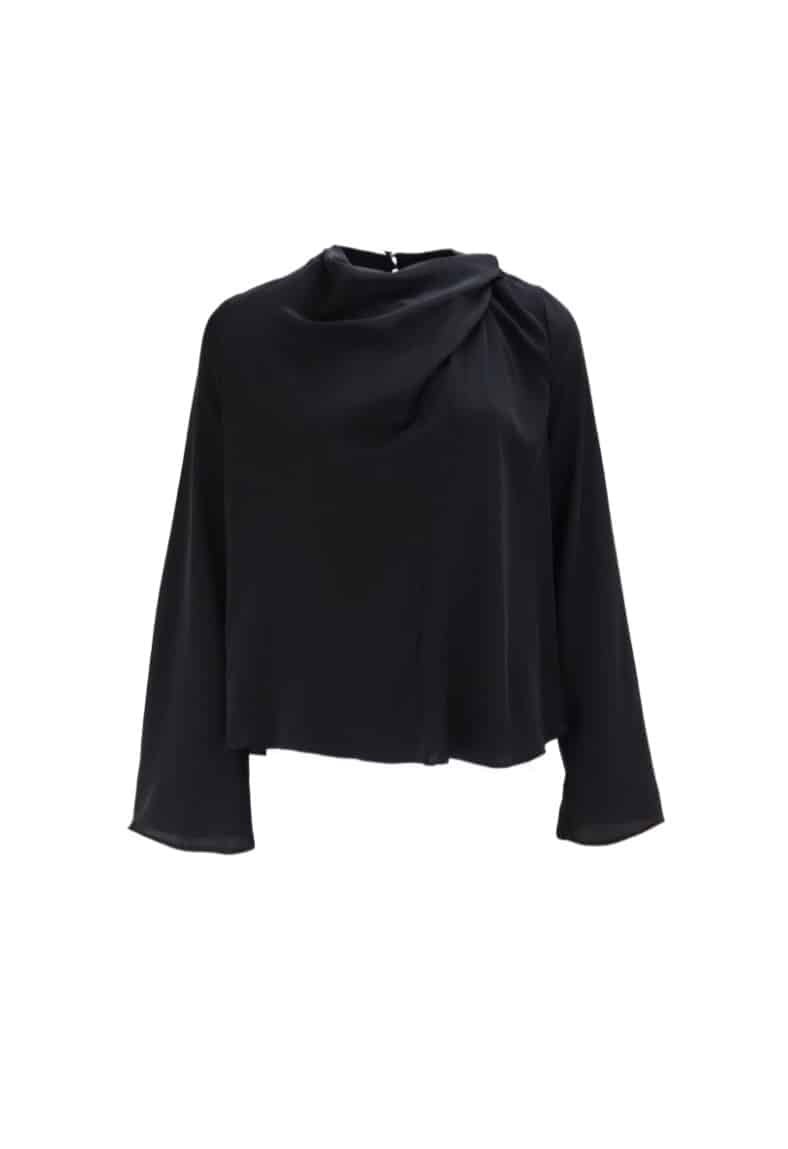 Mot. palaidinė, juodos spalvos, elegantiška, ilgomis rankovėmis, klostuota iškirptė, užsegimas sagomis.