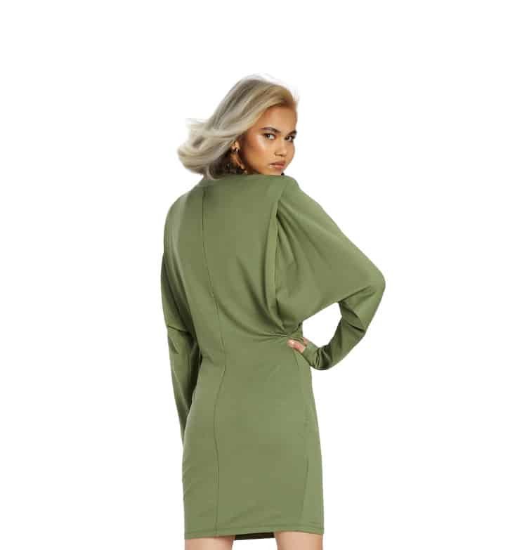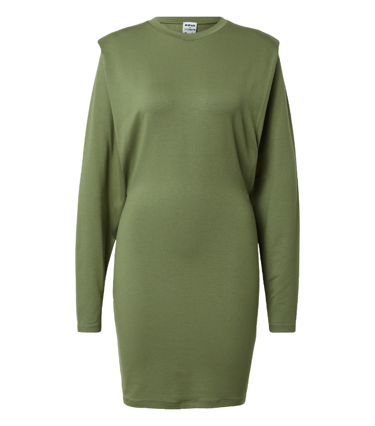 Mot. suknelė, žalios spalvos, ilgomis rankovėmis, apvali iškirptė.