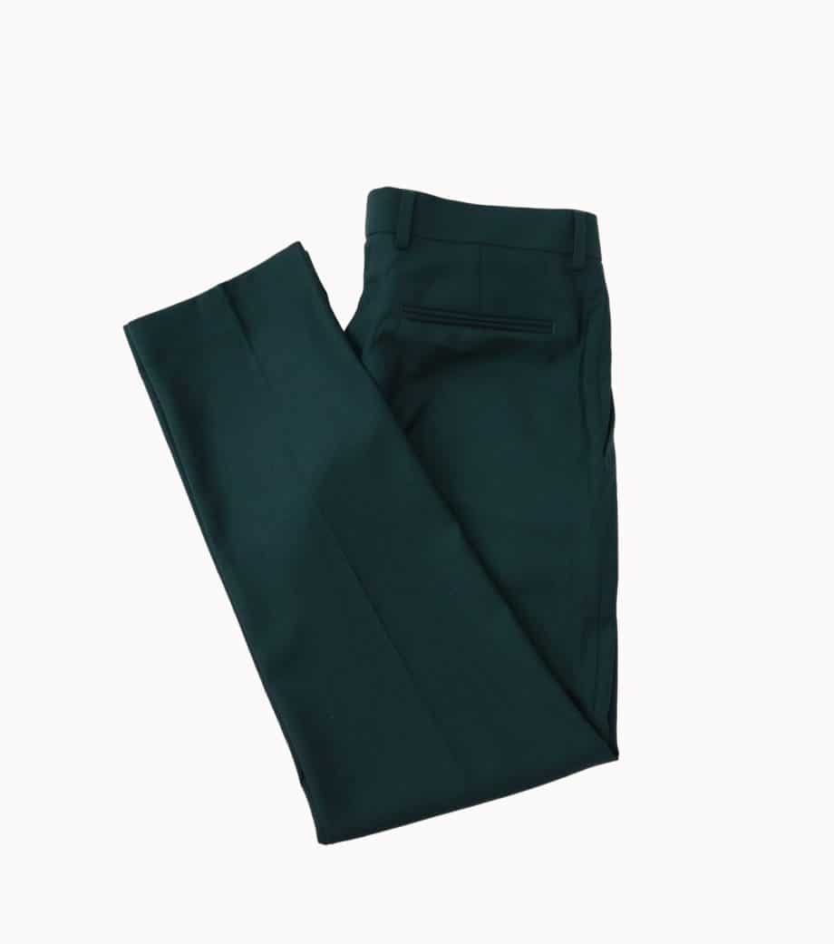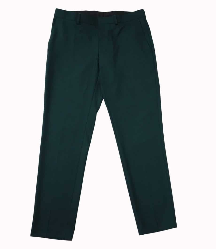 Vyr. kelnės, tamsiai žalios spalvos, klasikinio stiliaus, siaurėjančio kirpimo, užsegimas saga ir paslėptu užtrauktuku, šoninės ir galinės kišenės.