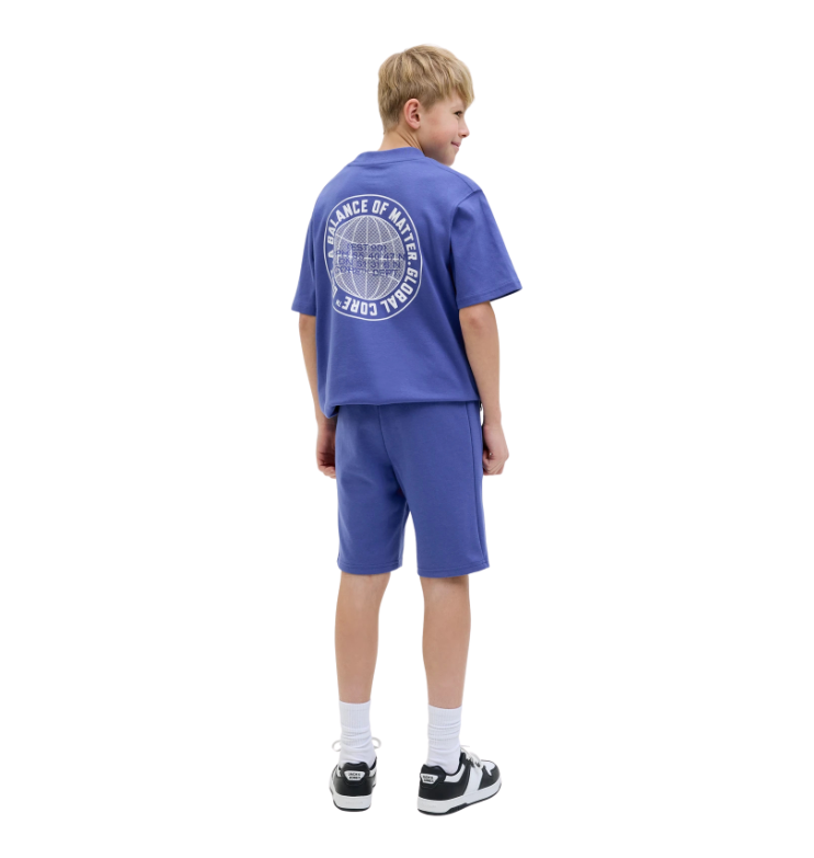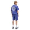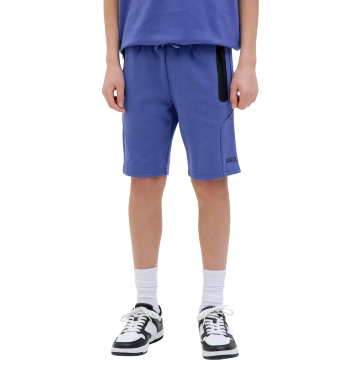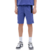 Vaik. šortai, mėlynos spalvos, elastinė juosmens juosta su raišteliais, šoninės kišenės su užtrauktuku, logotipo detalė.