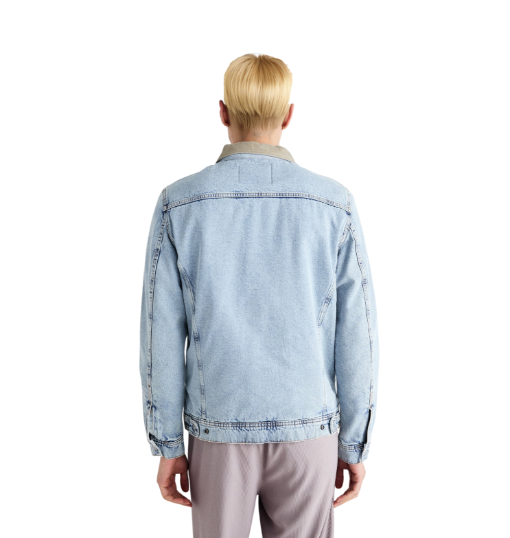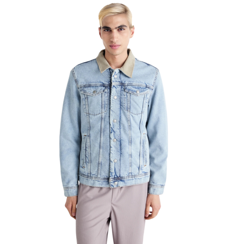 Vyr. džinsinis švarkas, žydros spalvos, ilgomis rankovėmis, atlenkiama apykaklė, krūtinės ir šoninės kišenės, užsegimassspaudėmis, su pašiltinimu viduje.