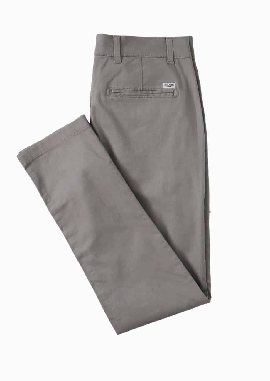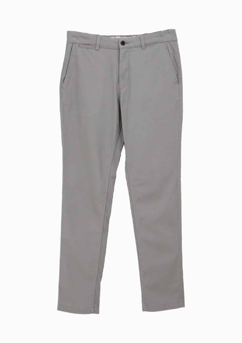 Vyr. kelnės, pilkos spalvos, siaurėjančio kirpimo, šoninės kišenės, diržo kilpos, užsegimas saga ir užtrauktuku.