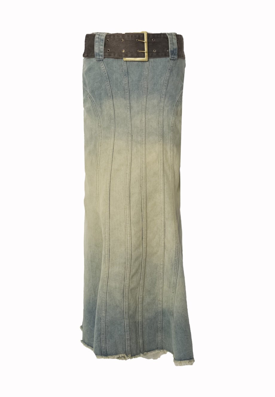 Mot. džinsinis maxi sijonas, žydros/ chaki spalvos, užsegimas užtrauktuku, diržas, tiesus kirpimas, platėjantis siluetas, ilgas.