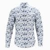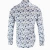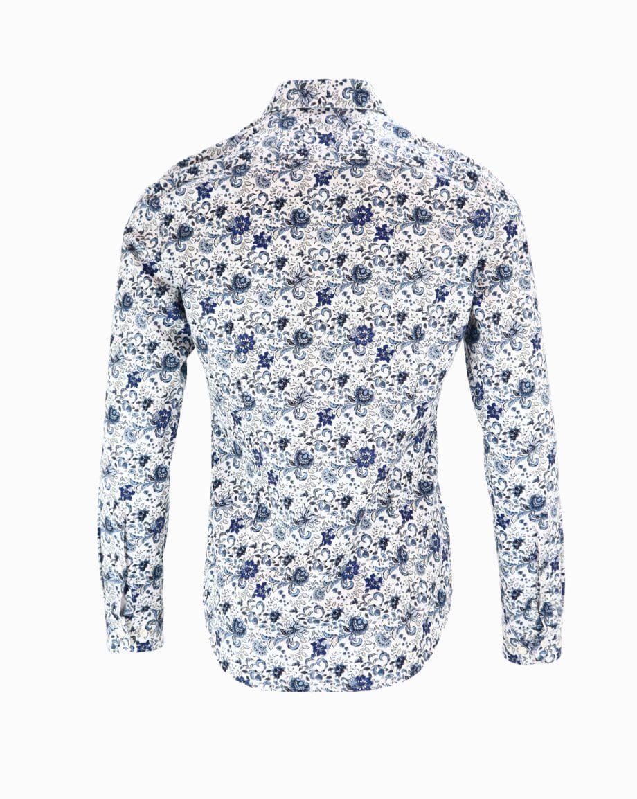 Vyr. Marškiniai, žydros spalvos, gėlėto rašto, ilgomis rankovėmis, atlenkiama apykaklė, užsegimas sagomis.