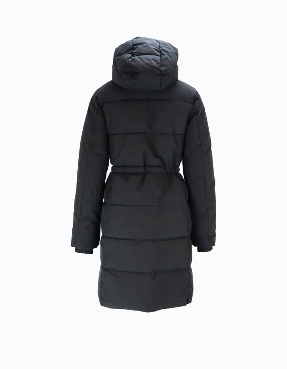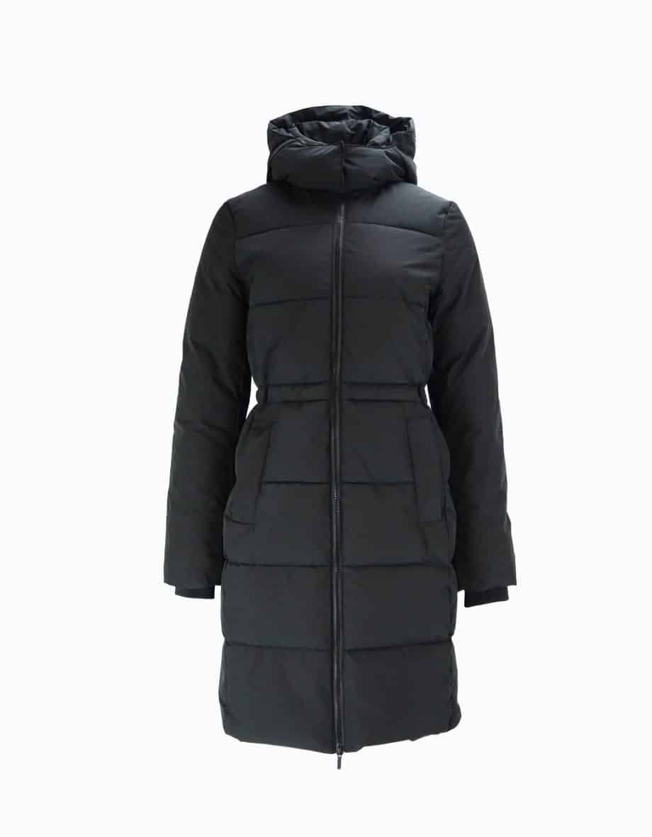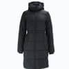 Mot. žieminis dygsniuotas paltas, juodos spalvos, ilgomis rankovėmis, dvipusis užtrauktukas, su gobtuvu, šoninės kišenės.