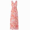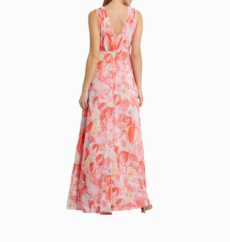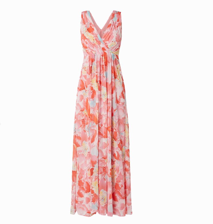 Mot. suknelė, rožinės spalvos, gili V formos iškirptė, be rankovių.