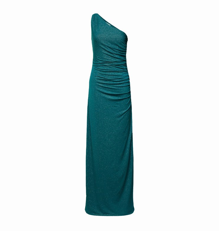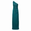 Mot. kokteilinė suknelė, žalios spalvos, vieno peties petneša, skeltukas suknelės šone, užsegimas užtrauktuku, raukiniai.