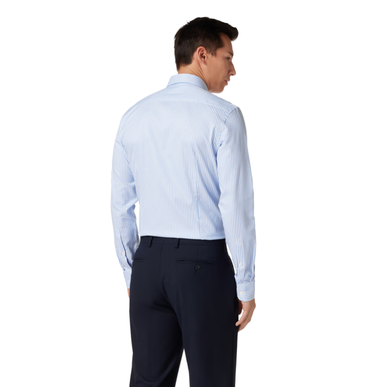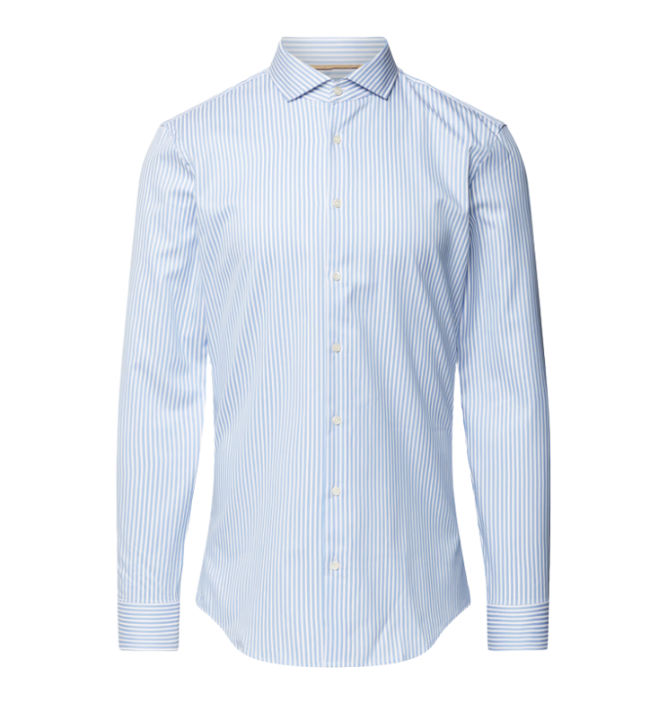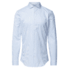 Vyr. marškiniai, žydros spalvos, ilgomis rankovėmis, kento apykalė, dryžuotas raštas, užsegimas per visą ilgį.