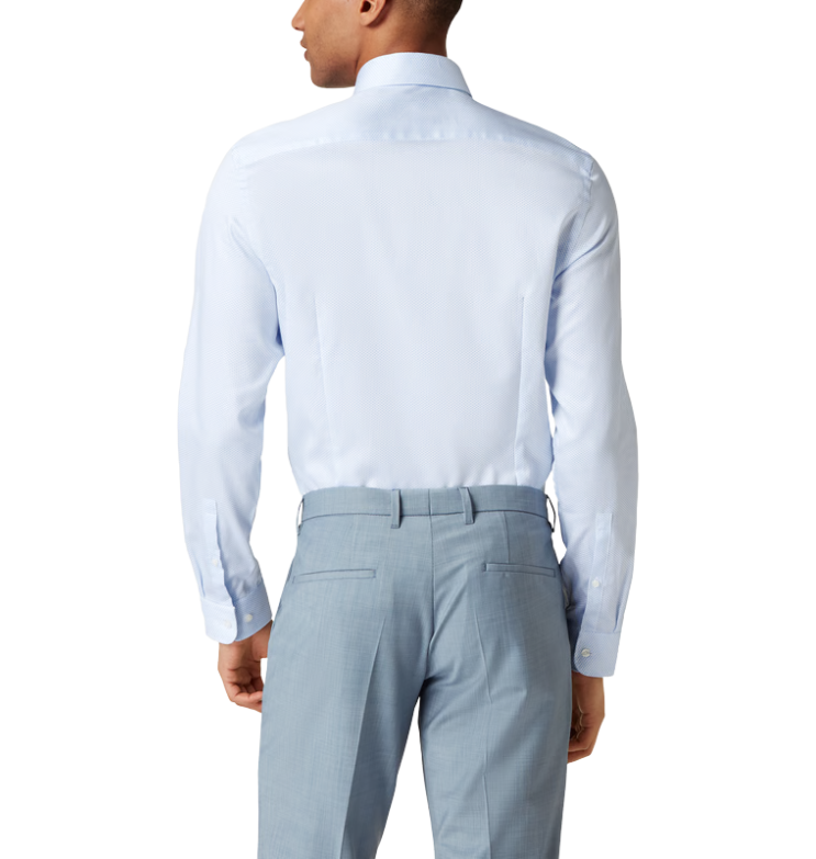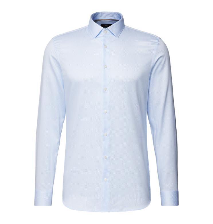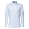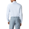 Vyr. marškiniai, žydros spalvos, ilgomis rankovėmis, kento apykaklė, dryžuotas raštas, užsegimas per visą ilgį.