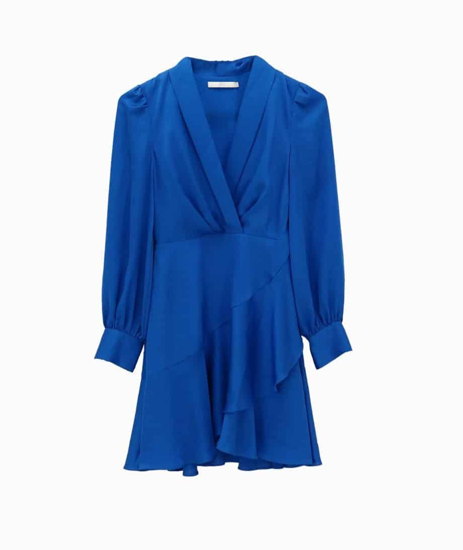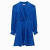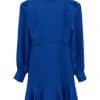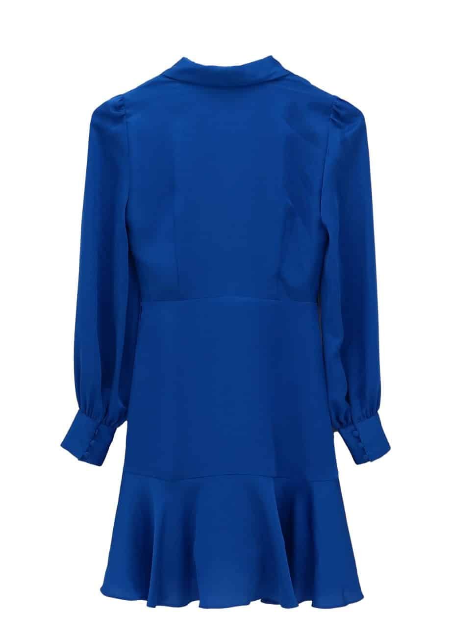 Mot. kokteilinė suknelė, mėlynos spalvos, V formos iškirptė, paprastas dizainas, juosmens diržas.
