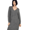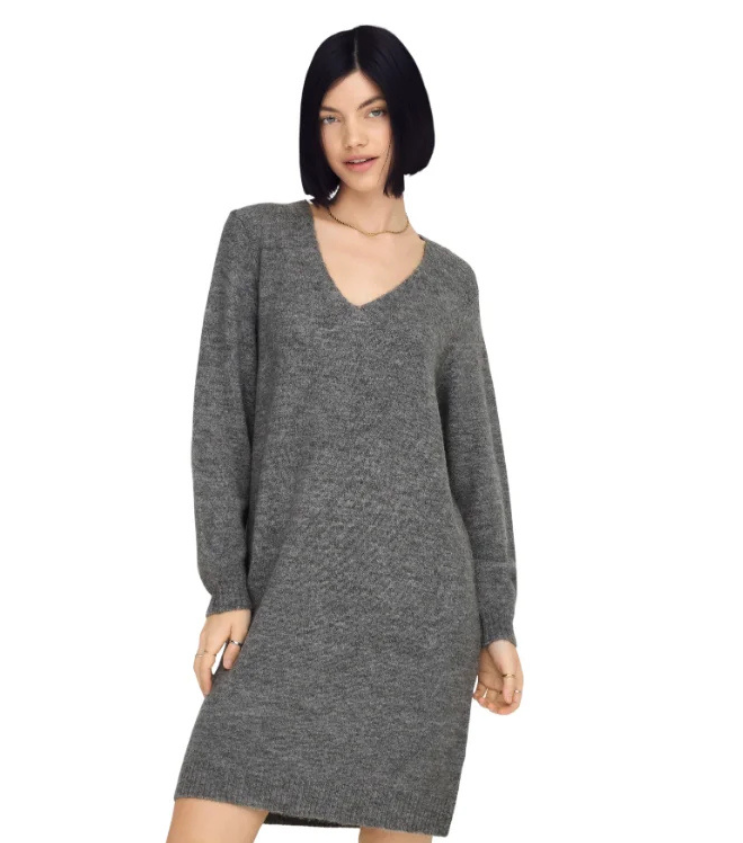 Mot. suknelė, pilkos spalvos, ilgomis rankovėmis, V formos kaklo iškirptė, megztas vienspalvis raštas.