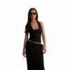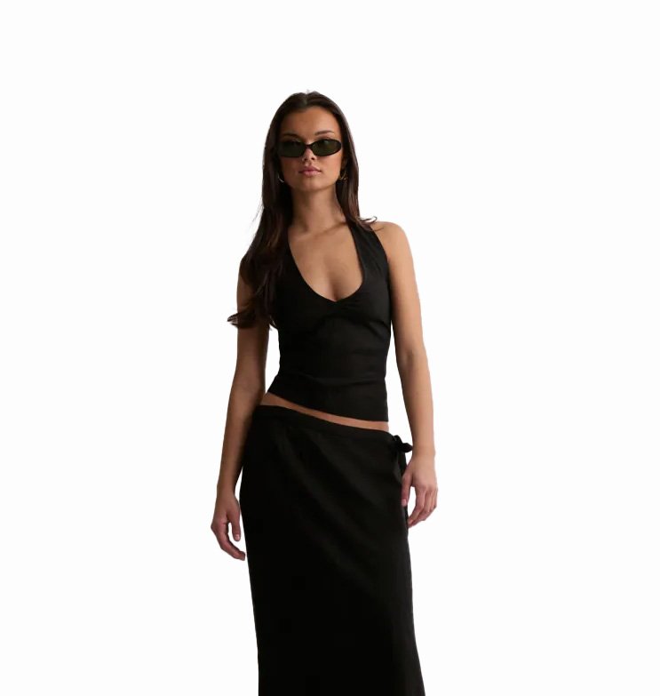 Mot. palaidinė, juodos spalvos, V formos iškirptė, be rankovių, surišama nugaroje, trumpas modelis, lino mišinys.