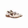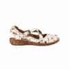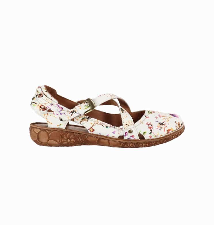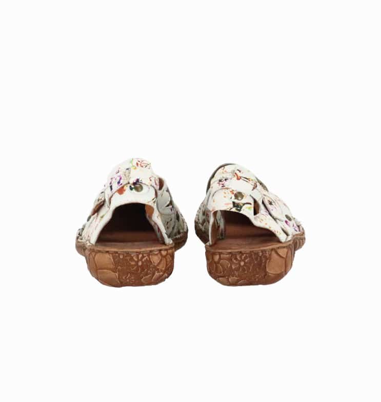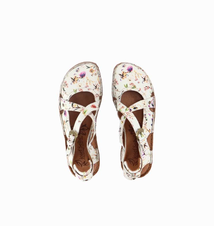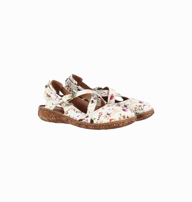 Mot. sandalai, kreminės spalvos, gėlių rašto, apvali batų nosis, kulnas plokščias, užsegimas sagtimi. Sezonas- Vasara/Pavasaris.