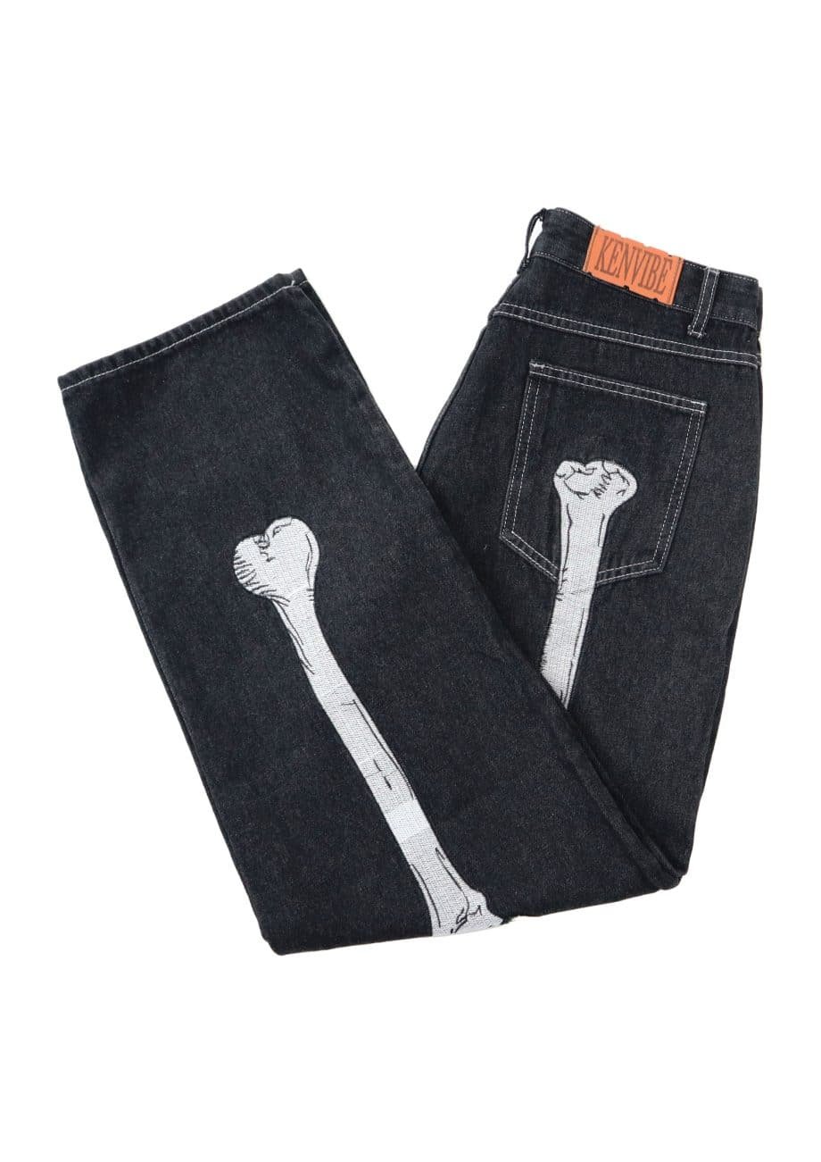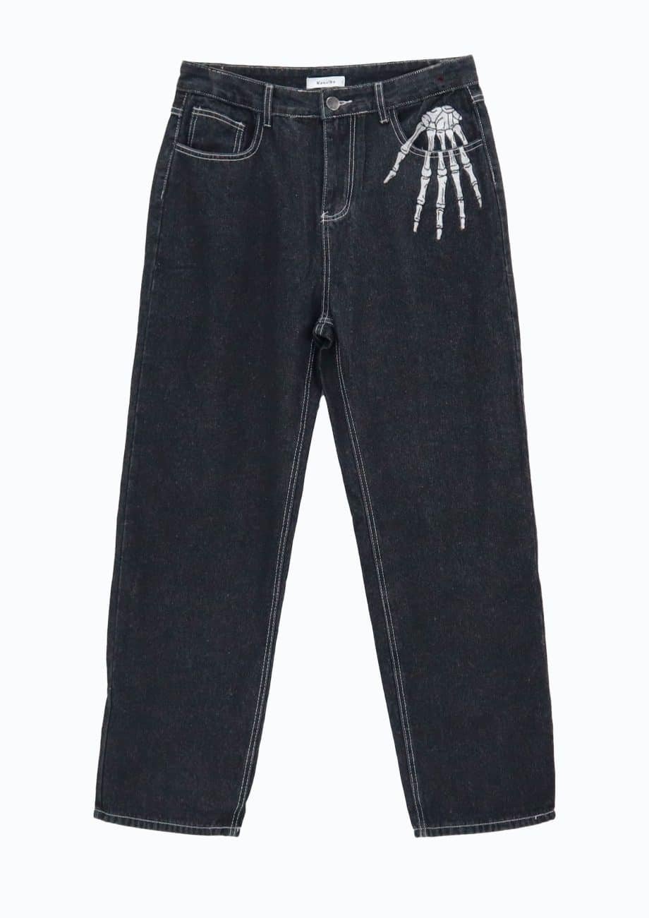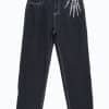 Vyr. džinsai, tamsiai pilkos spalvos, siuvinėti, platėjančio kirpimo, laisvo stiliaus, užsegimas sage ir užtrauktuku, 5 kišenių dizainas, diržo kilpos.