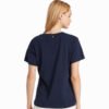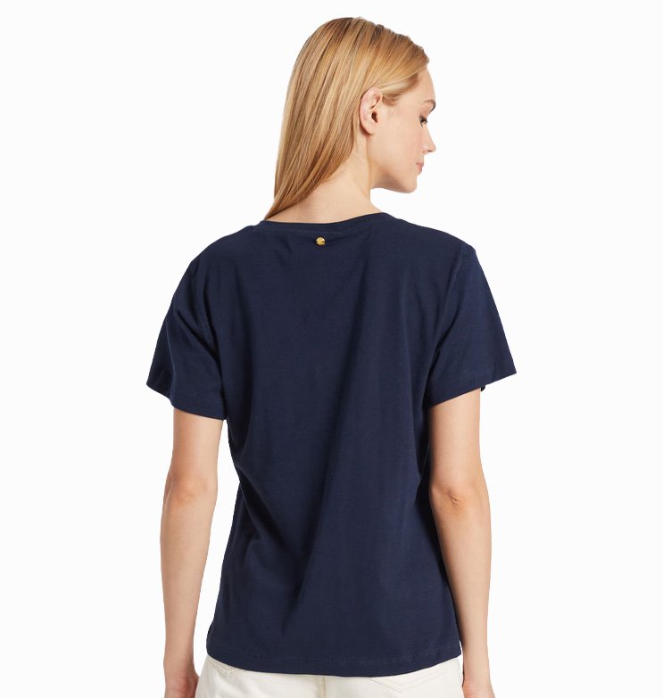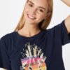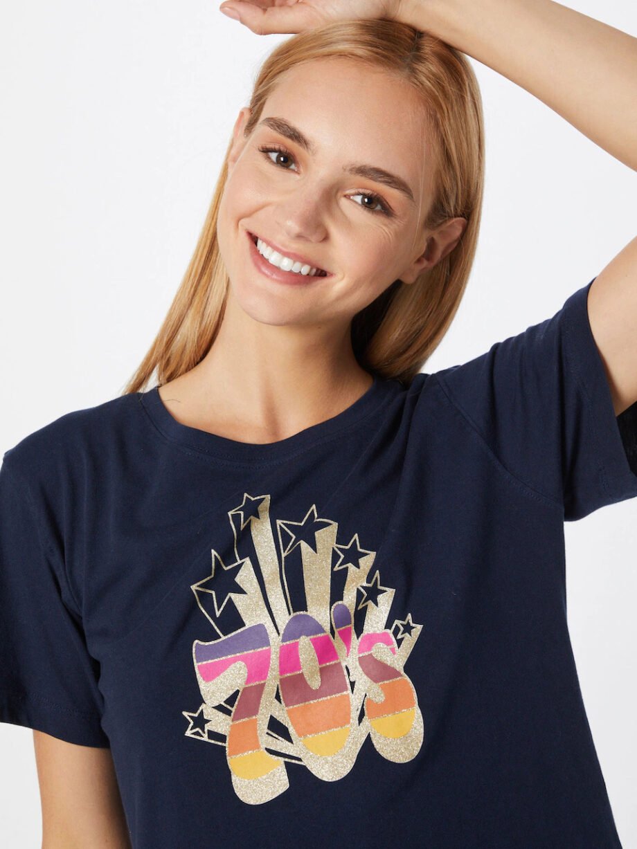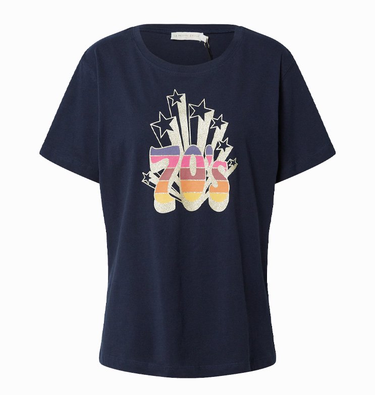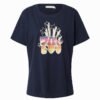 Mot. marškinėliai, tamsiai mėlynos spalvos, trumpomis rankovėmis, apvali iškirptė, priekinę dalį puošia spalvingas spaudinys.
