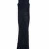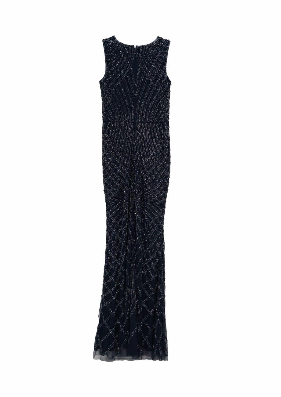 Mot. vakarinė suknelė, tamsiai mėlynos spalvos, be rankovių, ilga, paprastas spalvos dizainas, įgulos kaklas, dekoratyvinė apdaila, platėjanti sijono dalis, užsegimas užtrauktuku ir kabliuku.