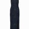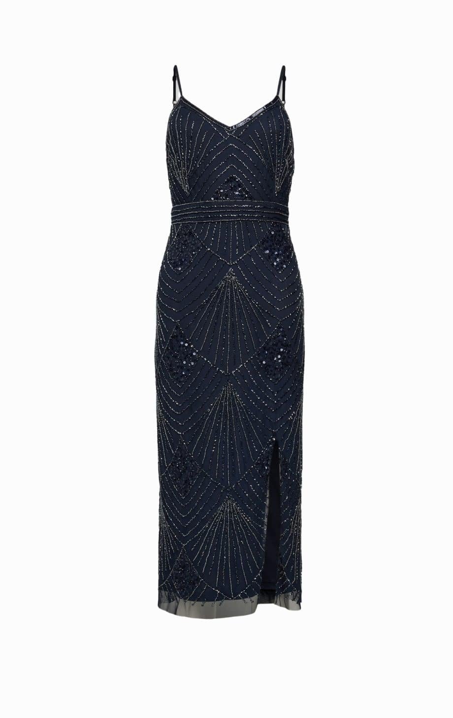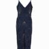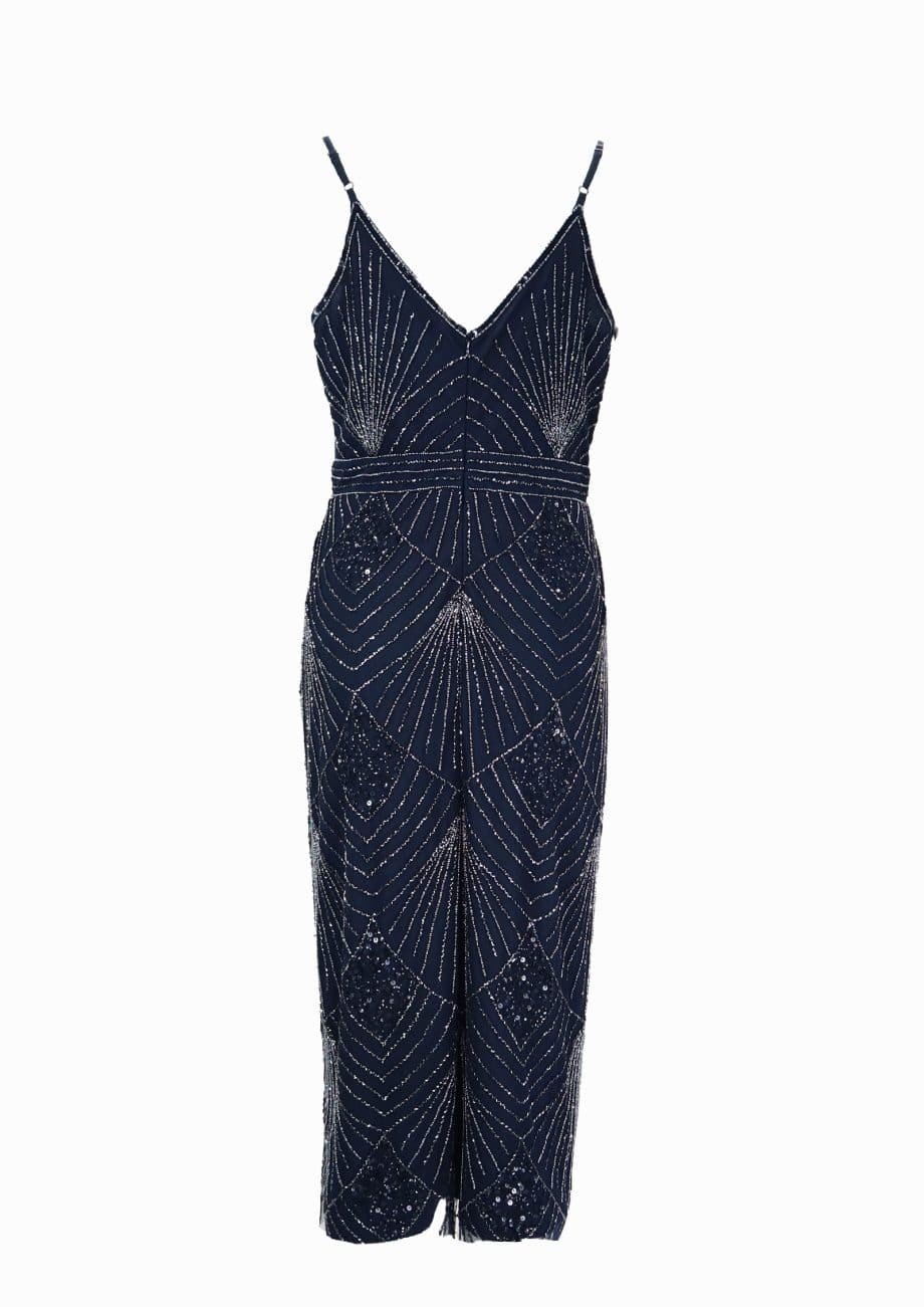 Mot. kokteilinė suknelė, tamsiai mėlynos spalvos, be rankovių, reguliuojamos petnešėlės, MIDI ilgio, priglundanti prie kūno, užsegimas nugaroje užtrauktuku, akmenukų dekoras.