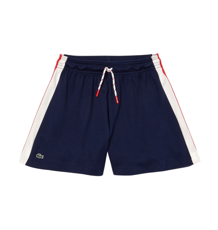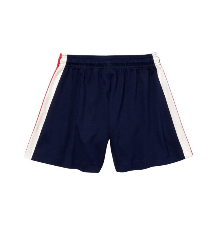 Vaik. šortai, tamsiai mėlynos spalvos, elastingas juosmuo reguliuojamas raišteliais, logotipo detalė.