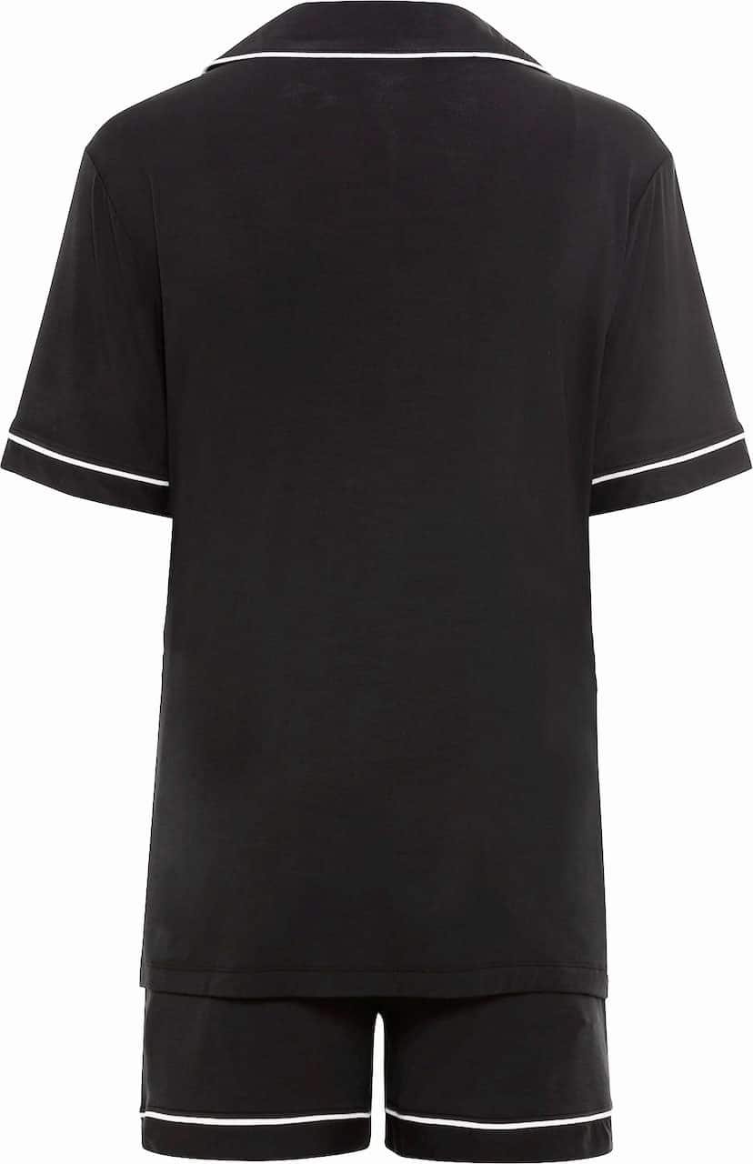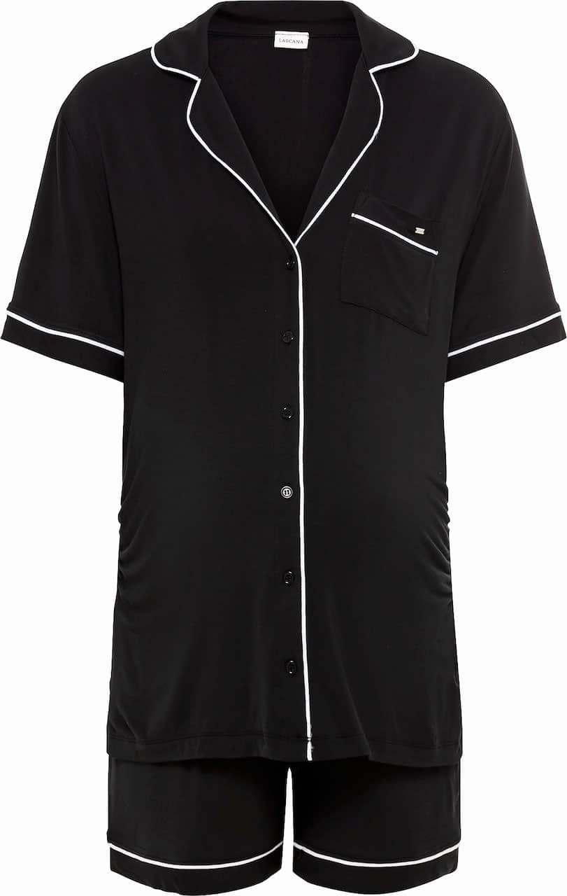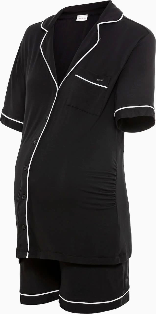 Mot. mamos pižama, trumpomis rankovėmis, atlenkiama apykaklė, užsegimas sagomis. Šortu ilgis virš pilvo, elastinė juosta.