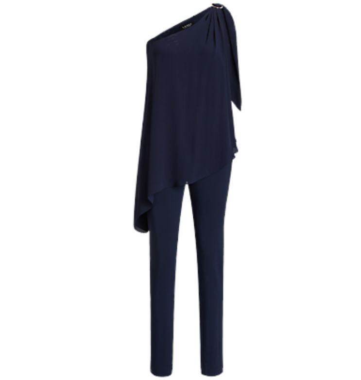 Mot, kombinezonas, tamsiai mėlynos spalvos. Laisvo kirpimo, pasiūtas ir tampraus audinio mišinio. Turi vieną petnešėlę ir detalę su logotipu.