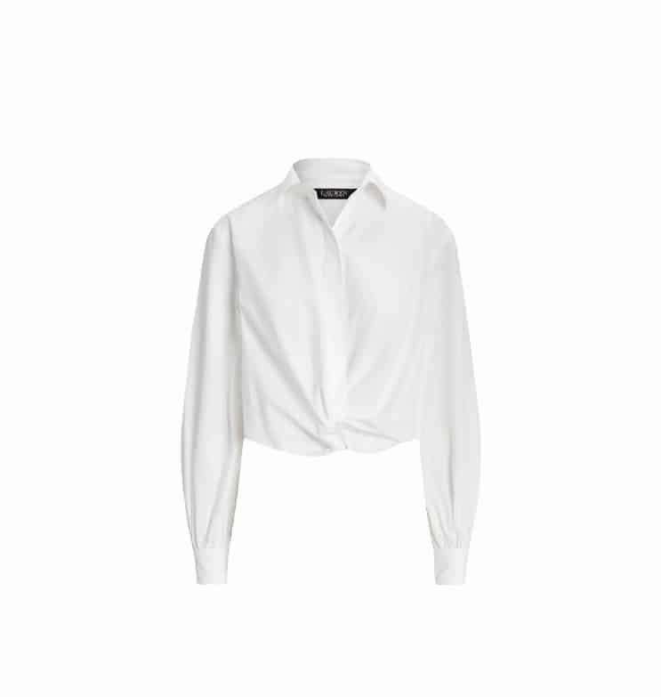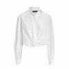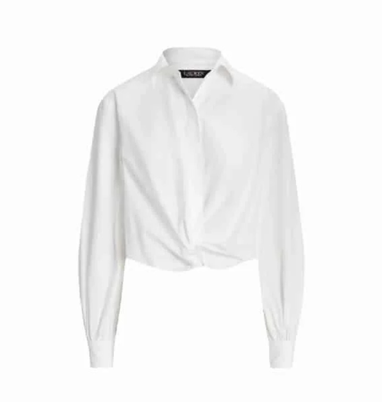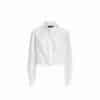 Vaik. marškiniai, baltos spalvos, ilgomis rankovėmis, apkarpytas siluetas ir susuktas priekinės dalies akcentas ties juosmeniu, užsegimas per visą ilgį.