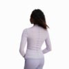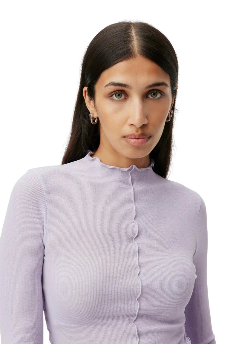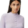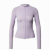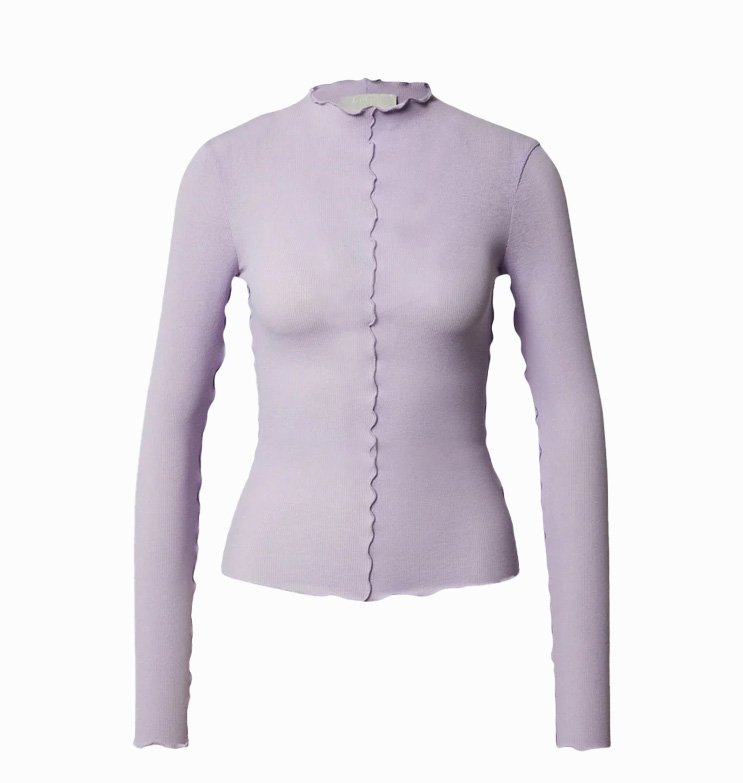Mot. golfas, violetinės spalvos, ilgomis rankovėmis, stati apykaklė, prigludes siluetas, ryškios siūlės, tampri medžiaga.