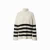 Mot. megztinis, baltos spalvos, su juodomis horizontaliomis juostomis, laisvo kirpimo oversized kirpimo, turintis aukštą platų kaklą, rankovės gana plačios, su apverčiamomis rankogalių detalėmis.