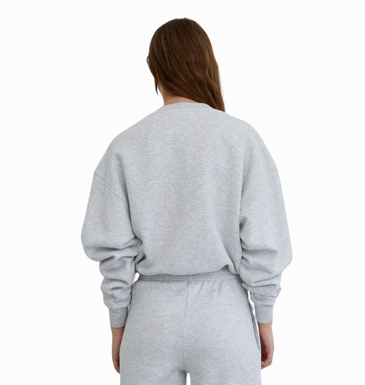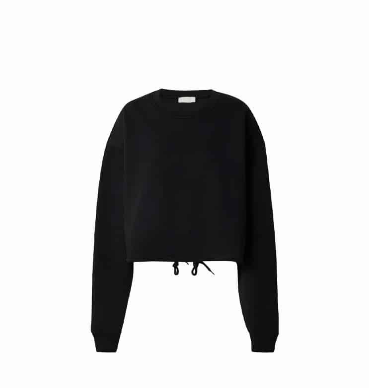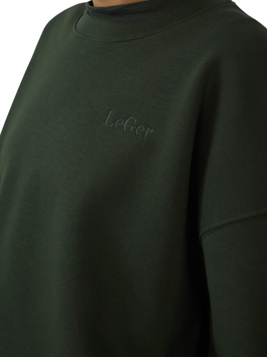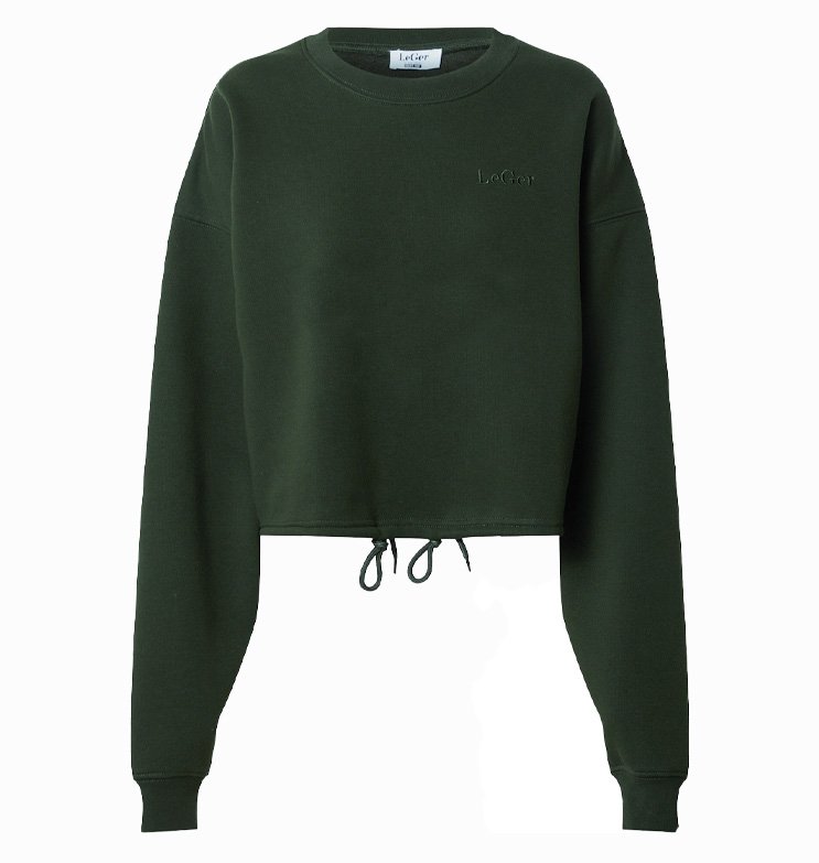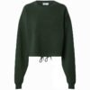 Mot. džemperis, tamsiai žalios spalvos, ilgomis rankovėmis, apvali iškirptė, logotipo detalė, apačioje reguliuojamas raišteliais, Crop stilius.