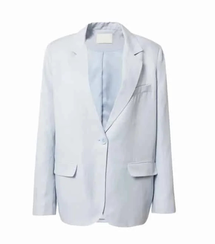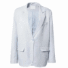 Mot. švarkas, žydros spalvos, ilgomis rankovėmis, atlenkiama apykaklė, V formos iškirptė, užsegimas saga.
