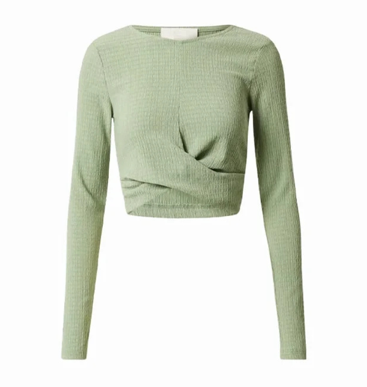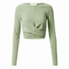 Mot. palaidinė, žalios spalvos, ilgomis rankovėmis, modelis yra trumpintas, prigludęs prie kūno, susukta dizaino detale priekyje.