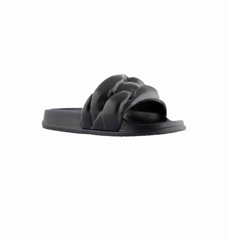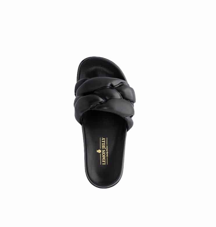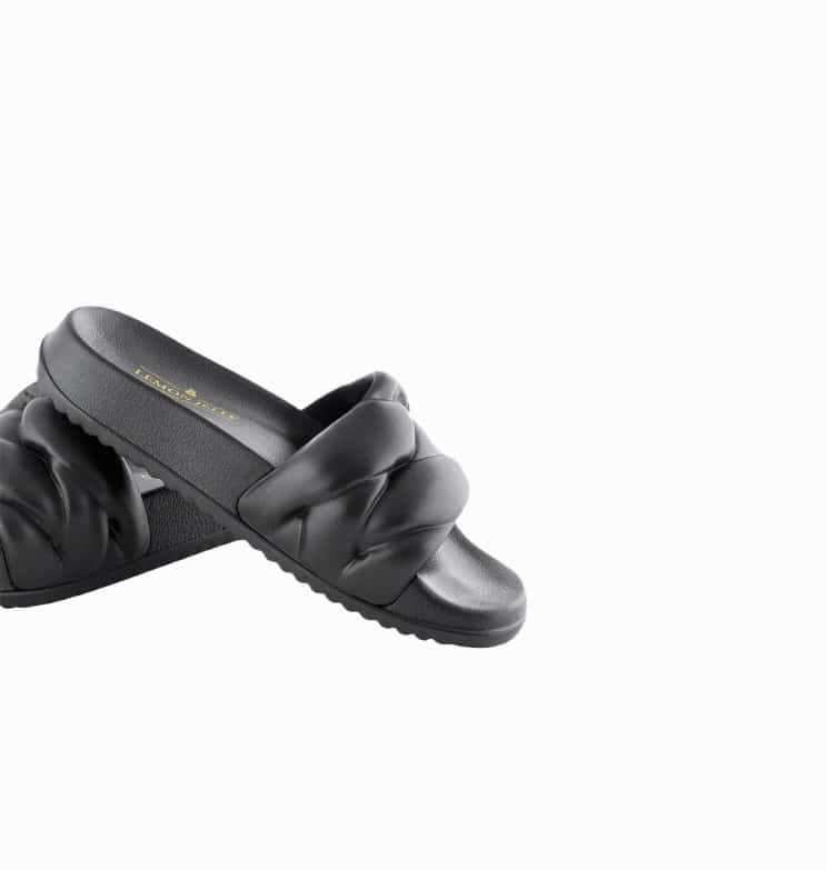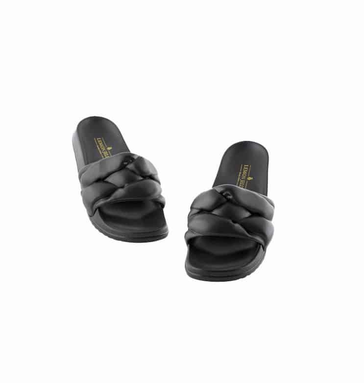 Mot. šlepetės, juodos spalvos, atvira ir apvali batų nosis, vienspalvės, lankstus padas, kasdieninės. Sezonas- Vasara.