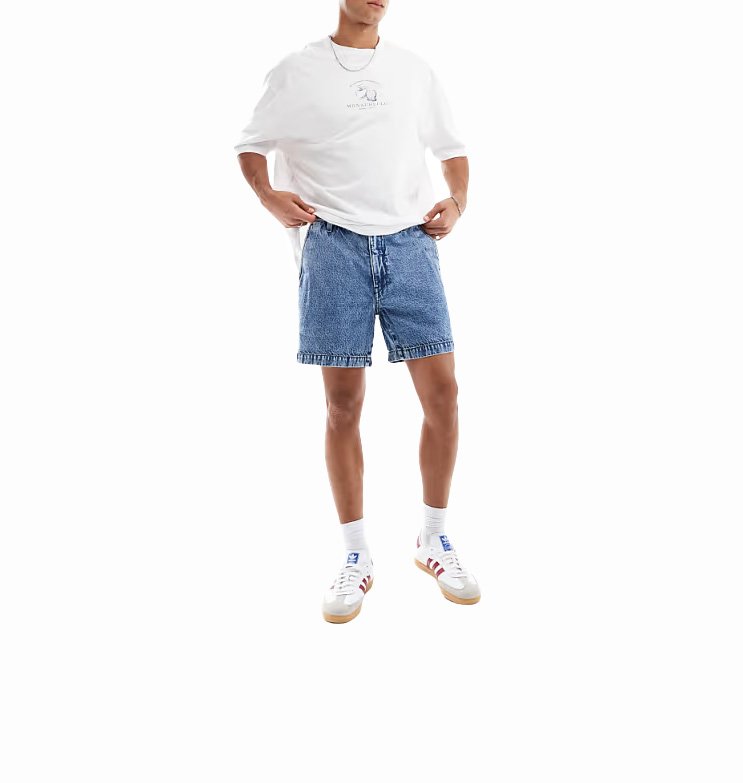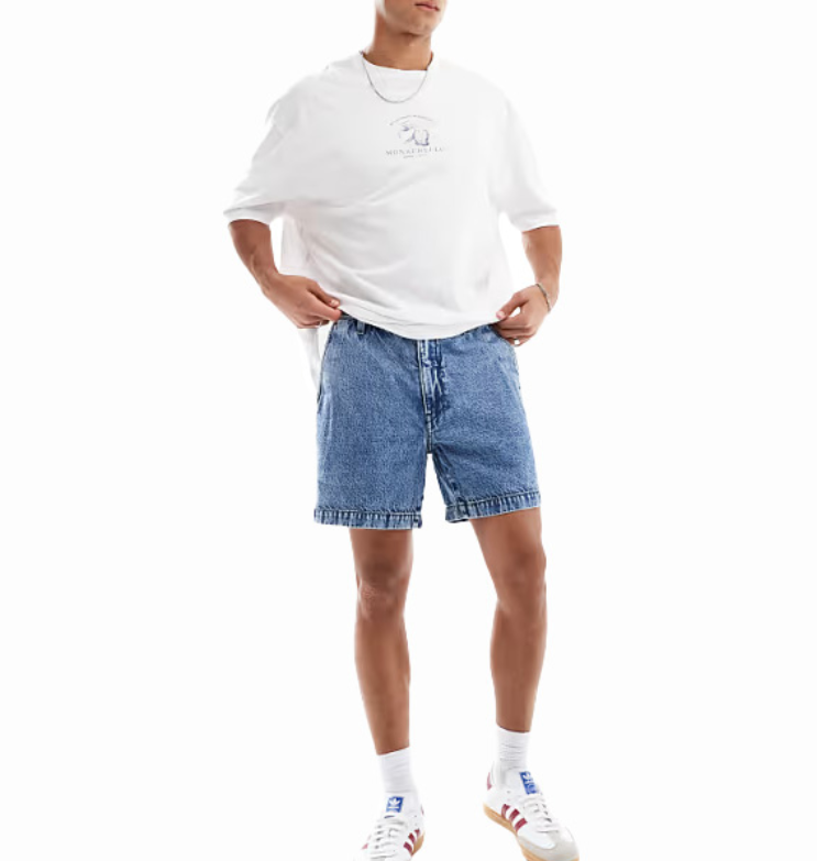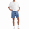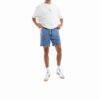 Vyr. džinsiniai šortai, žydros spalvos, šoninės kišenės, užsegimas sagute ir užtrauktuku, diržo kilpos.