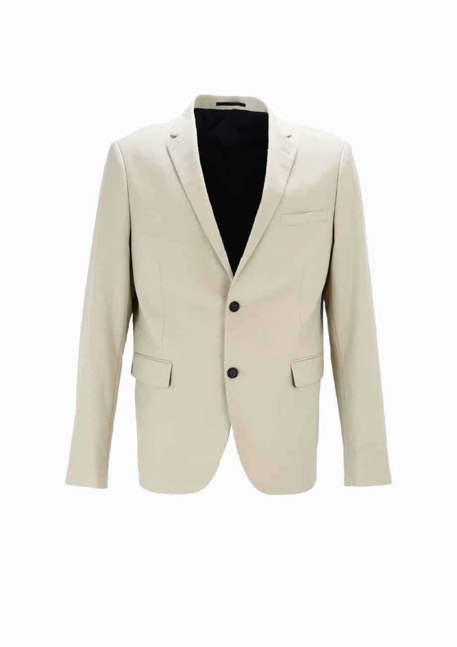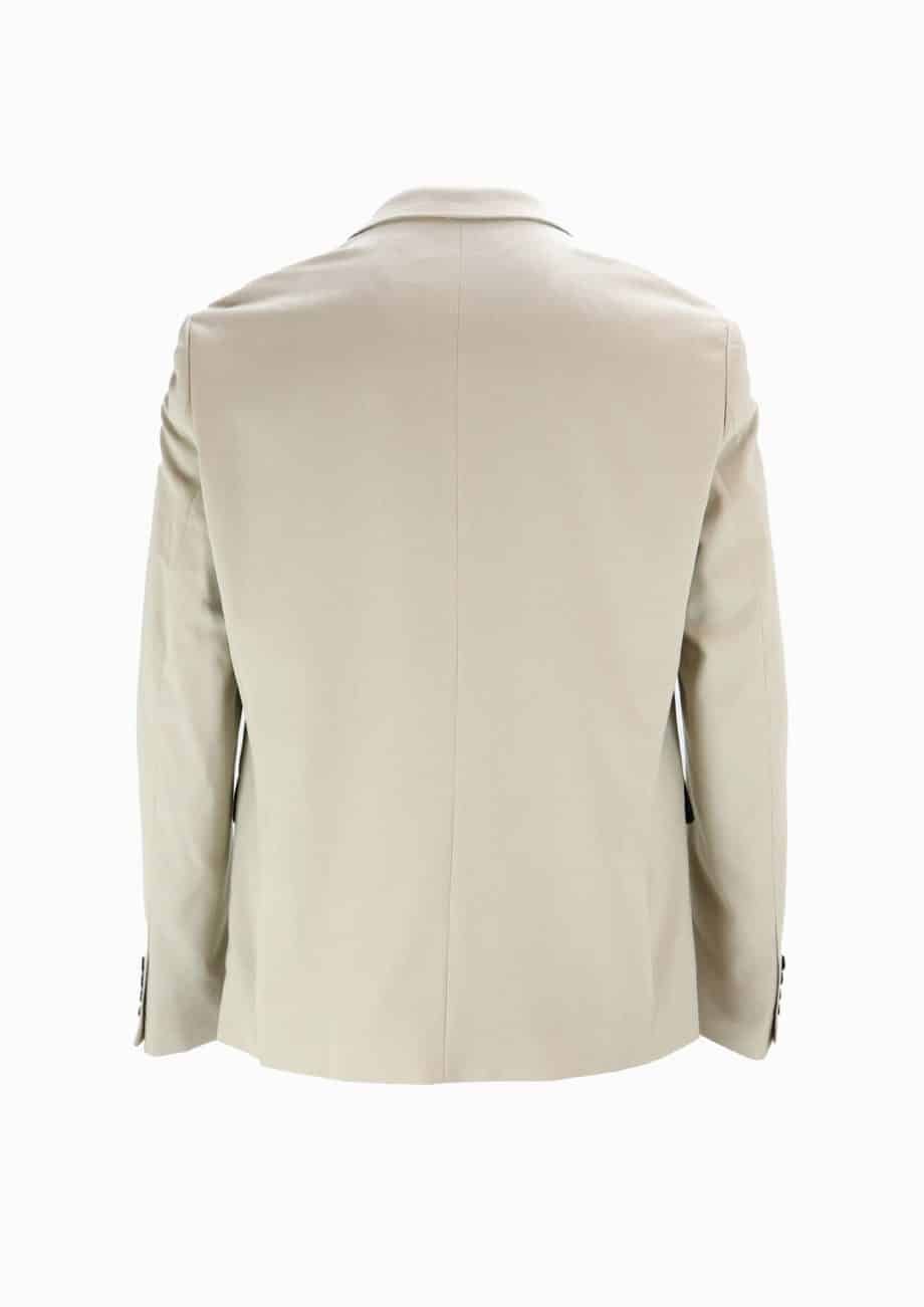 Vyr. švarkas, smėlio spalvos, V formos iškirptė, užsegimas sagomis, ilgos rankovės, elegantiškas dizainas, šoninės kišenės.