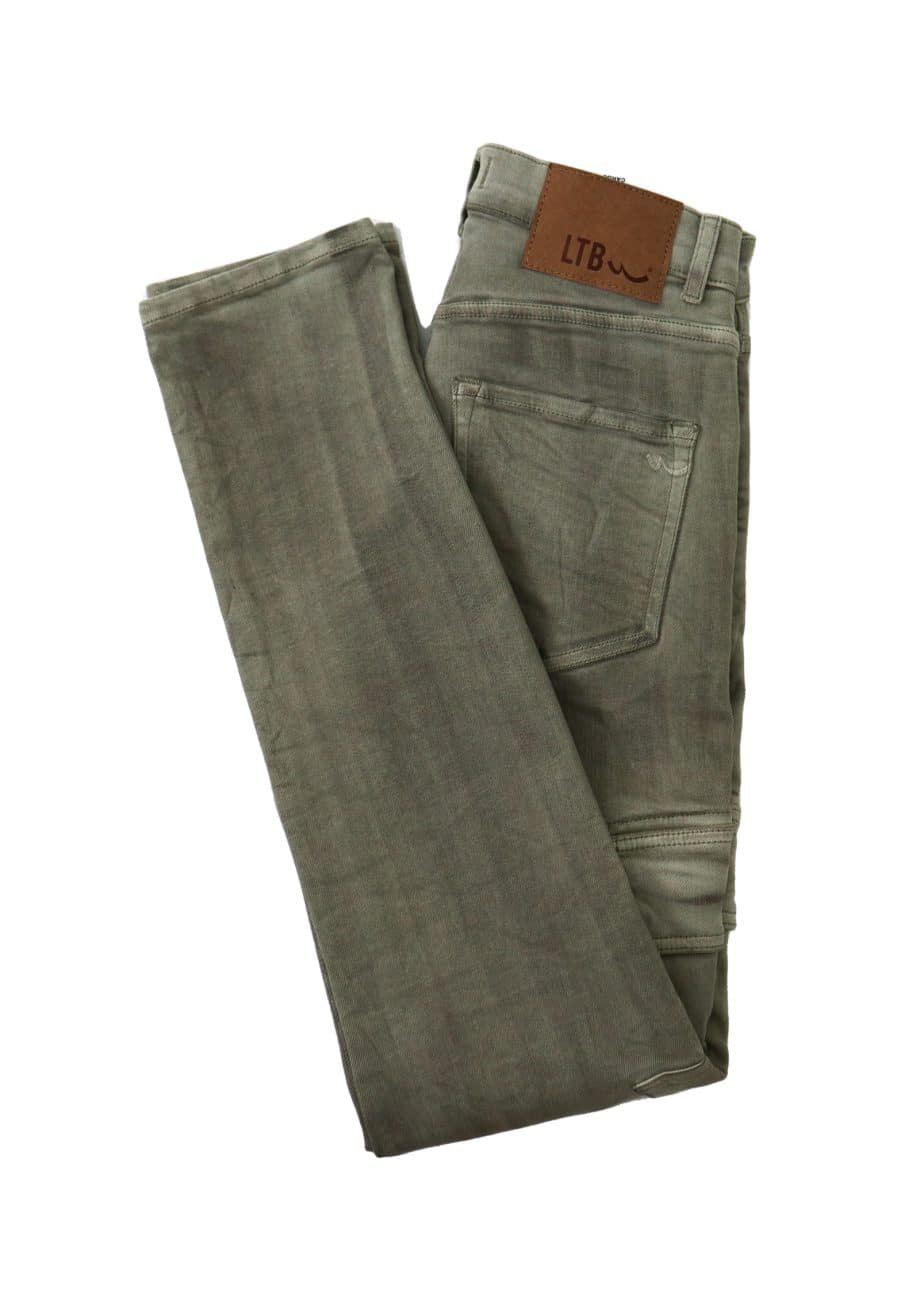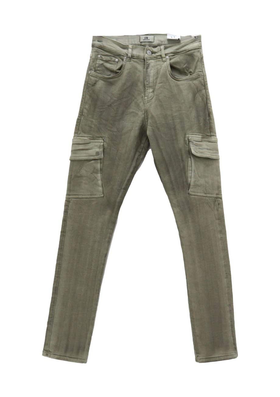 Vyr. džinsai, žalios spalvos, Cargo stiliaus, tiesaus kirpimo, šoninės kišenės, 5 kišenių dizainas, diržo kilpos, užsegimas saga ir užtrauktuku.