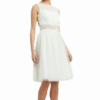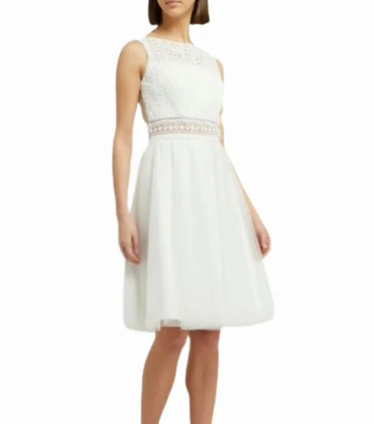 Mot. vestuvinė suknelė, baltos spalvos, mini ilgis, apvali kaklo iškirptė, be rankovių, užsegimas užtrauktuku, platėjantis sijonas.