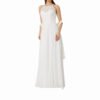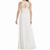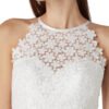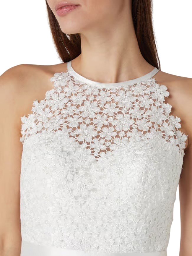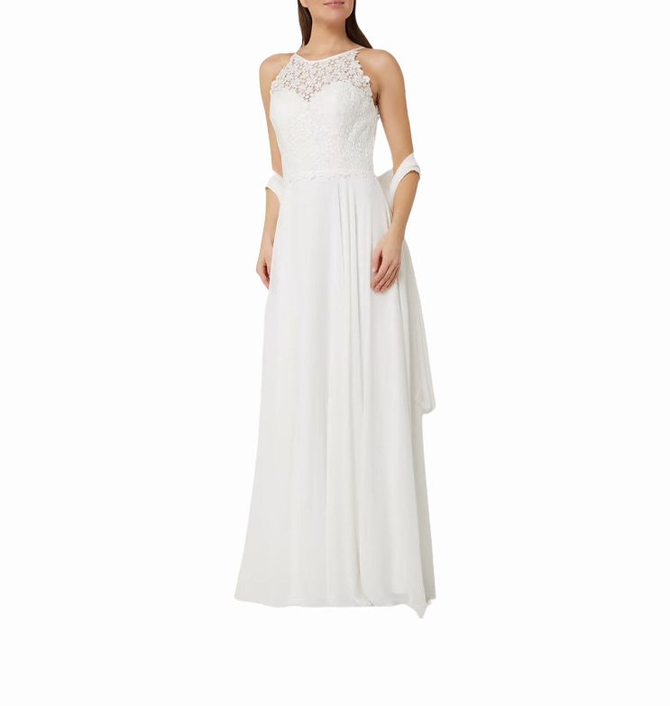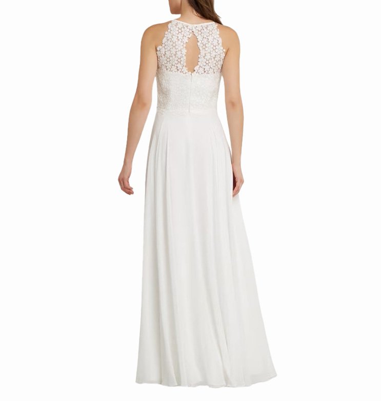 Mot. vestuvinė suknelė, baltos spalvos, apvali kaklo iškirptė, maxi ilgis, platėjantis sijonas, gėlių raštas, užsegimas sagute ir užtrauktuku.