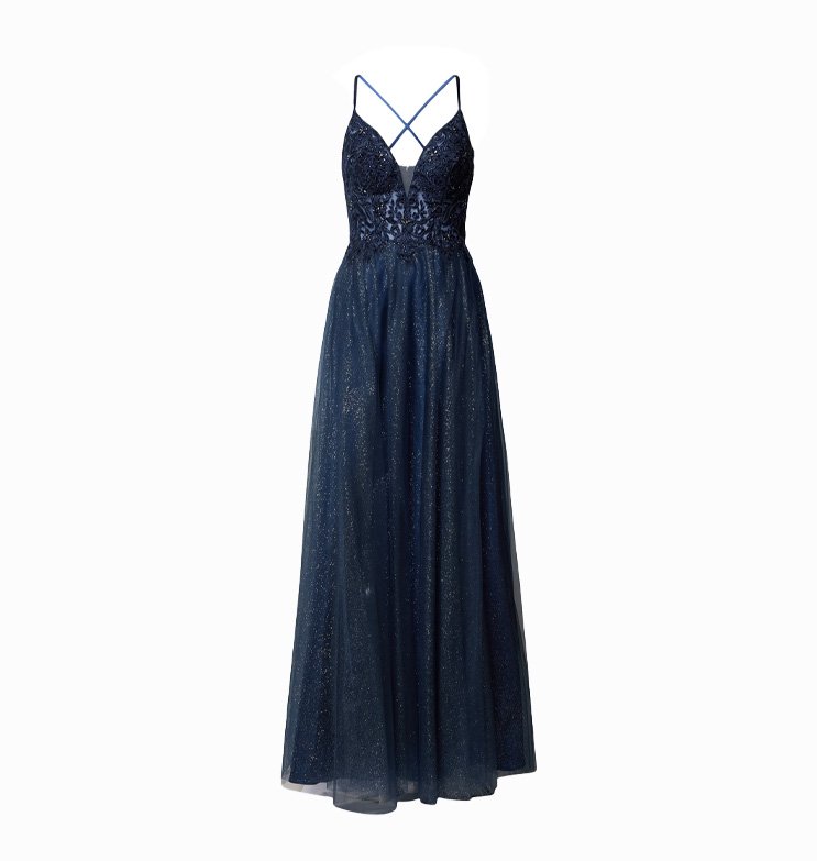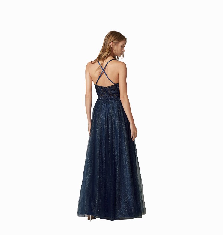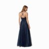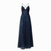 Mot. vakarinė suknelė, tamsiai mėlynos spalvos, V formos iškirptė, maxi ilgis.