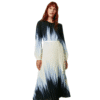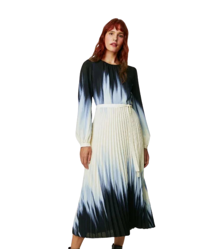 Mot. suknelė, tamsiai mėlynos spalvos, ilgomis rankovėmis, apvali kaklo iškirptė, ombre raštas, klostuota.
