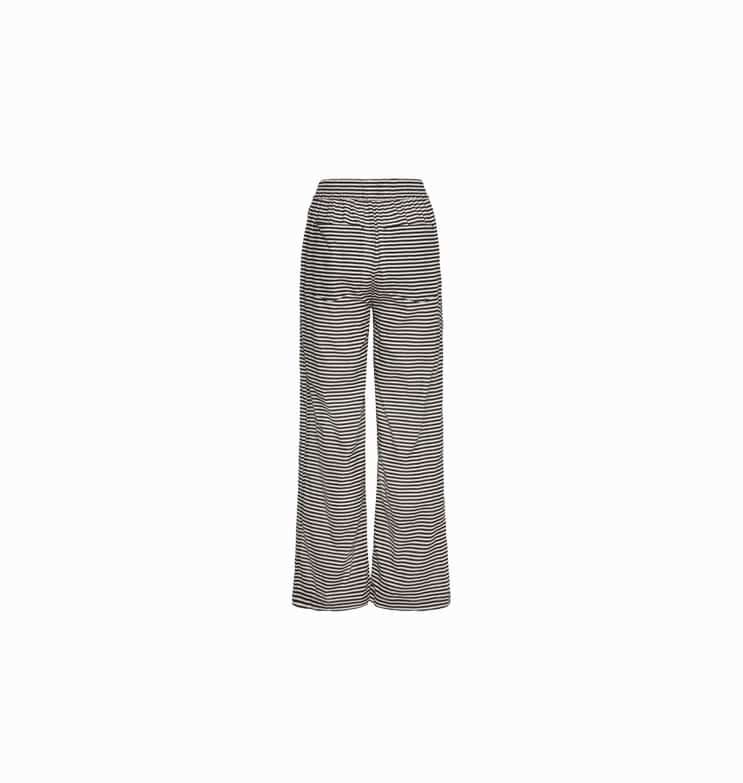 Mot. kelnės, spalva juodai balta, horizontaliomis juostelėmis, juosmuo elastingas, siluetas platus ir laisvas, dvi kišenės.