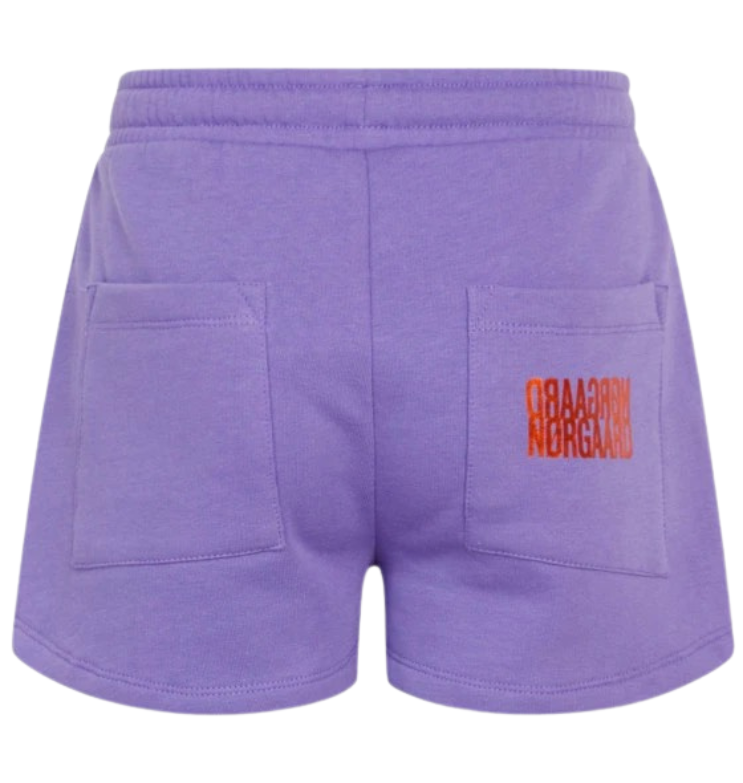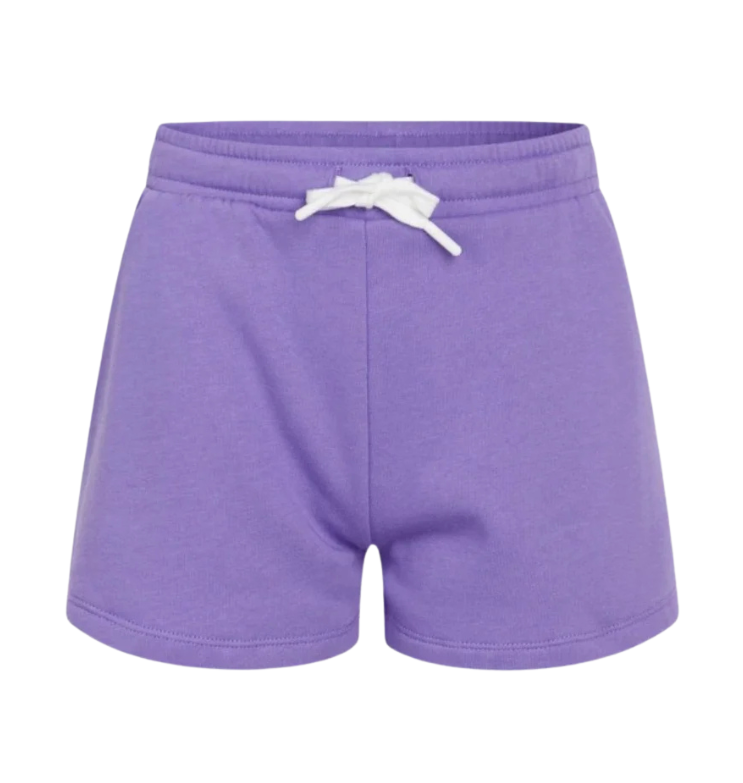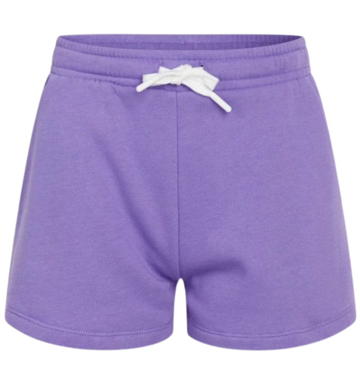 Vaik. šortai, violetinės spalvos, elastingas juosmuo su raišteliais, šoninės ir galinės kišenės, logotipo detalė.