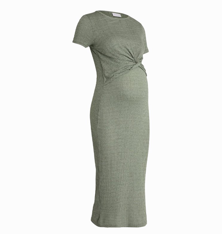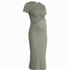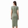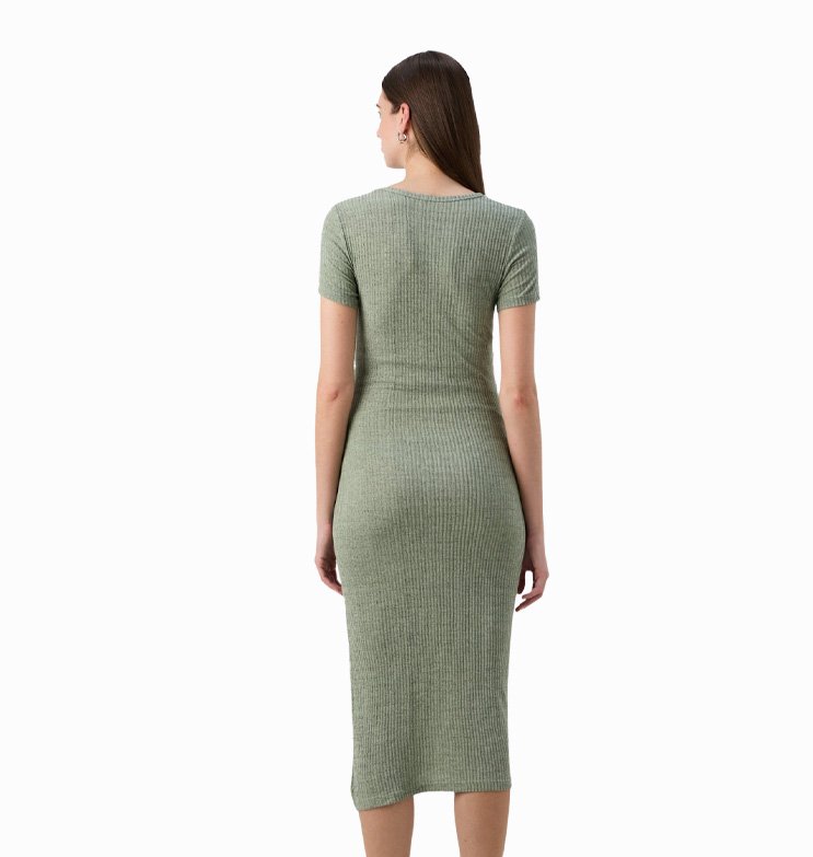 Mot. suknelė, žalios spalvos, trumpomis rankovėmis, apvali kaklo iškirptė, priglundanti prie kūno, midi ilgis.