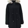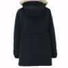 Mot. mamos striukė, juodos spalvos, ilgos rankovės, ilgis iki kelių, gobtuvas su nuimamu dirbtinio kailio kraštu, dydžiui reguliuoti skirta virvutė.