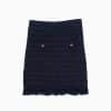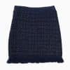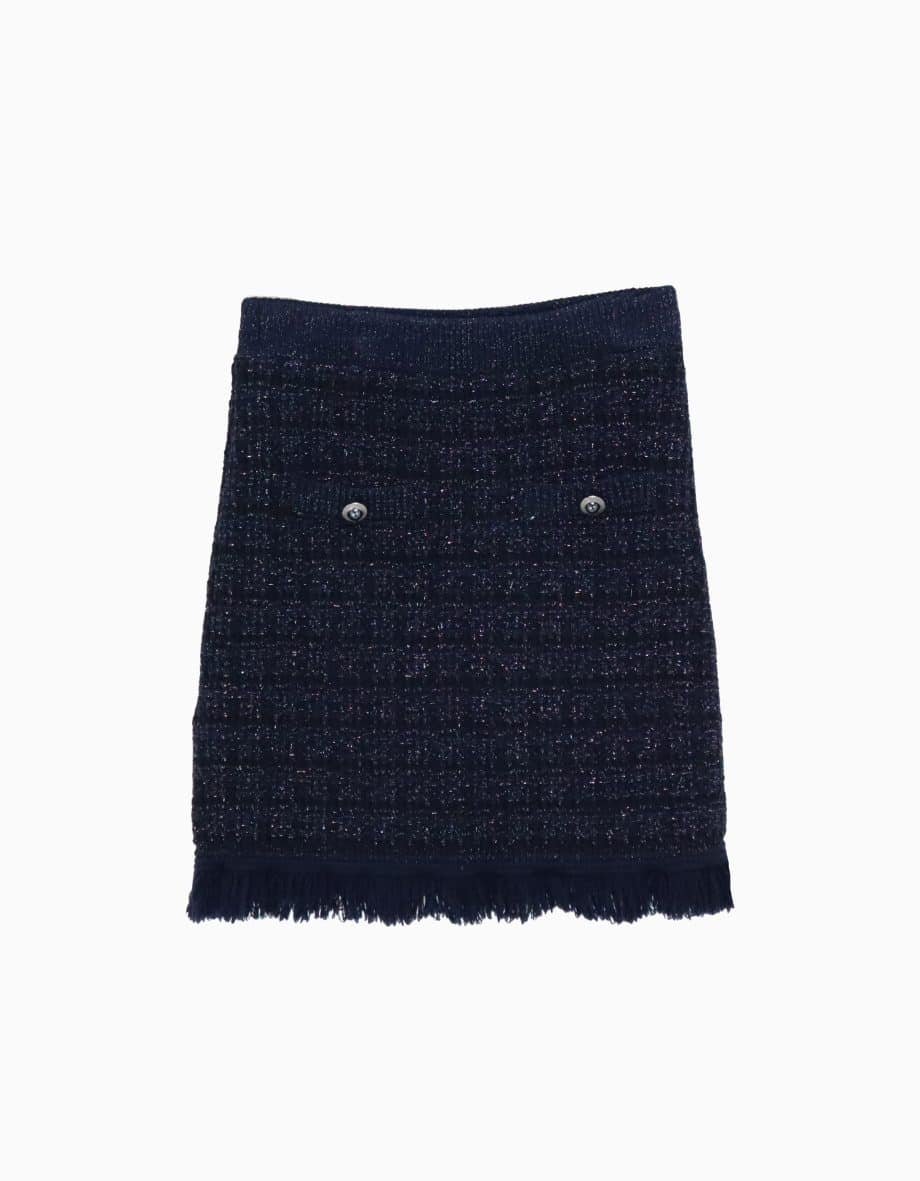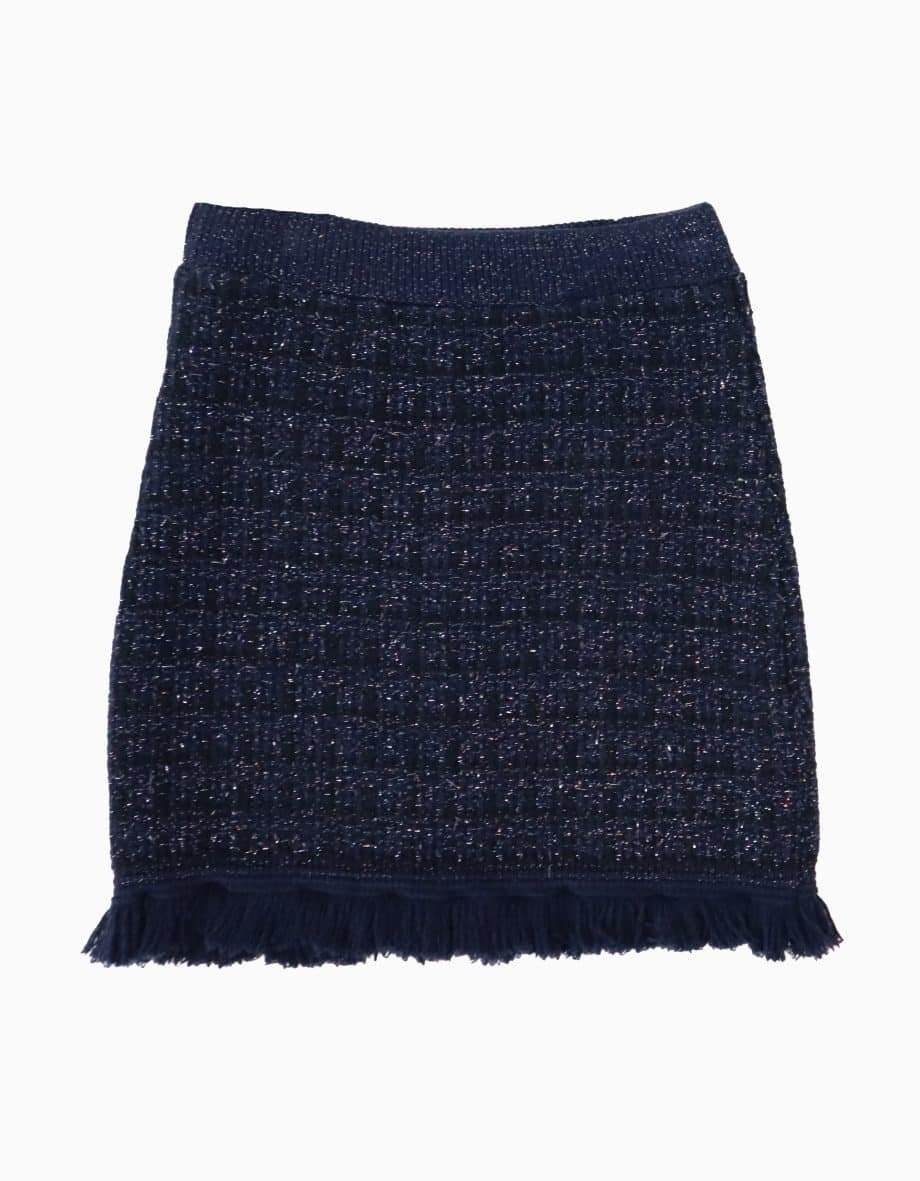 Mot. sijonas, tamsiai mėlynos spalvos, elastingas juosmuo, mini ilgio, kišenių imitacija, blizgučių detalės, megzto rašto.